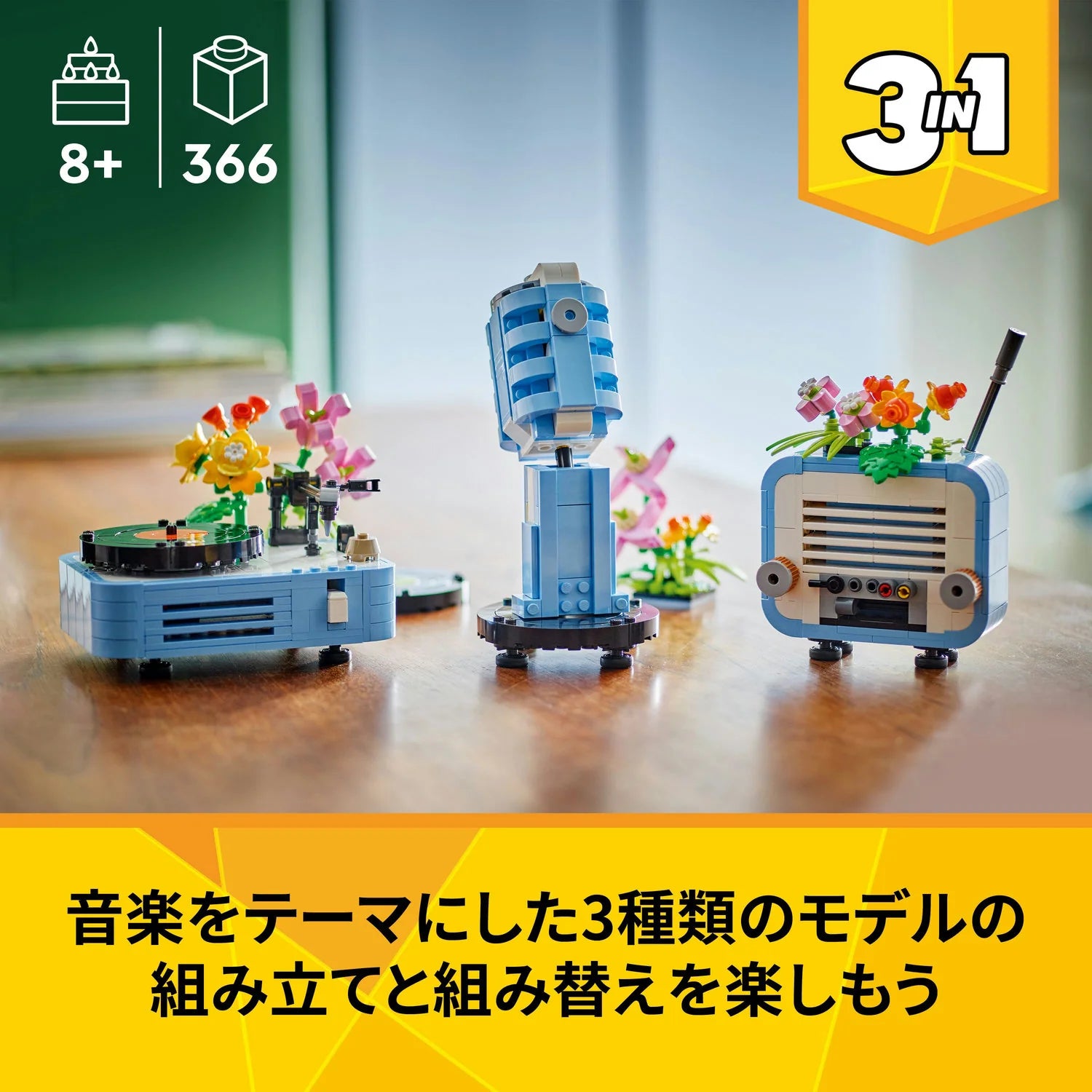 LEGO fans have the choice of 3 different music set building options: a record player with flowers; a retro-style radio toy with moving buttons, an adjustable aerial and removable flowers; or a rotating classic microphone with a stand of flowers. Each model can be used for fun role play or as an attractive home decor display item.