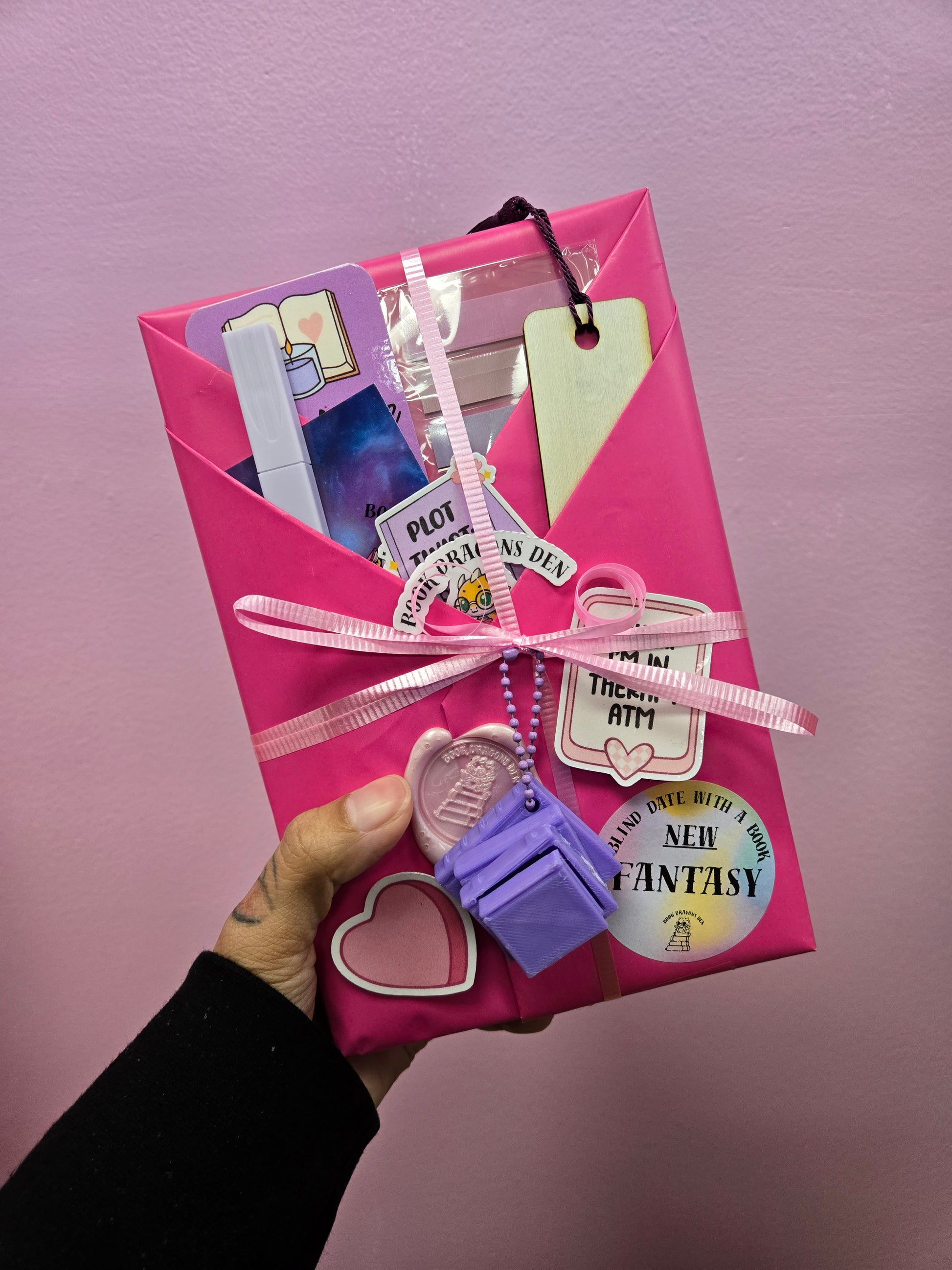 Each book is thoughtfully wrapped and includes delightful and mostly handmade (by us) treasures - a cute bookmark, a wooden bookmark, fun stickers, a fidget clicker, pastel highlighter, annotation stickers along with a pouch of hot chocolate and a peppermint tea bag.