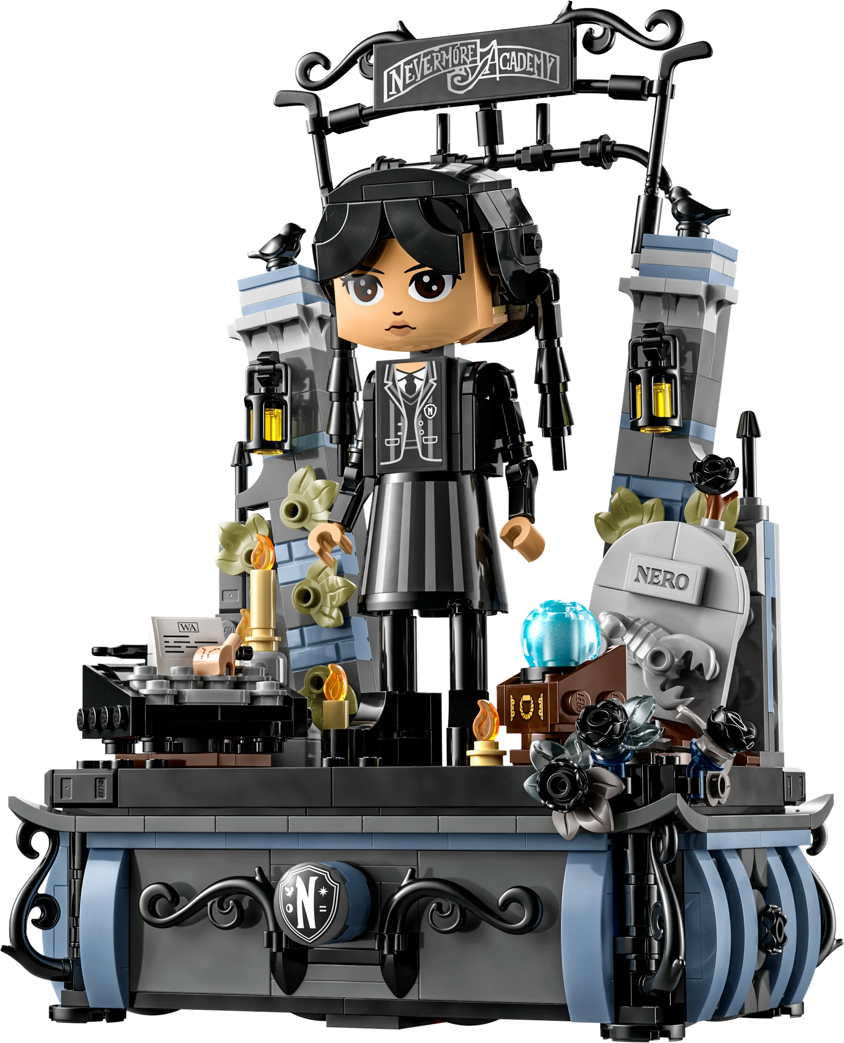 Mysteries and mayhem await kids aged 10 and up in the Wednesday Addams Figure (76780) set. This LEGO® Wednesday gift set features a collectible, posable model with movable head, arms and feet, plus 2 faces and 2 outfits so the figure can be rebuilt. The set includes her loyal sidekick Thing, a stand with toy black dahlias and 2 hidden spaces to hold treasures like the Rave’N Dance dress or her uniform. There’s also the Nevermore Academy gate and Wednesday’s accessories, including her typewriter, Nero’s grave, a crystal ball and more.